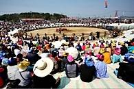 闘牛といえば少々怖いイメージがありますが、闘牛たちの、頭突き、腹打ち、角を引っ掛けて引っ張り合うなど様々な技能を駆使し戦う姿は圧倒的な迫力があります。 |