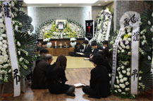 人の一生で避けて通れない「死」。ここでは韓国のお葬式事情をご紹介します。まず人が亡くなるとお通夜を行いますが、最近では病院で亡くなる人が多いため、病院の地下の斎場で通夜、葬儀まで執り行う病院葬が都心を中心に主流になっています。葬儀の期間は一般的に三日間(三日葬)行われますが、事情によって二日(二日葬)で済ます家庭も増えてきました。最近亡くなられた故金大中(キムデジュン)元大統領のケースでは6日葬の形がとられました。葬儀の段取りは日本とあまり変わりませんが、特徴的なのが「悲しみを最大限に表現」すること。日本人の「静かに故人を見送る」お葬式とは大分雰囲気が違います。