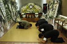 葬儀場では、まず故人に線香を立てます。遺影に向かいお辞儀(クンジョル:土下座)を2回半行い、遺族に向き直りお辞儀を1回行います。香典は箱が準備されているので、その中に入れます。