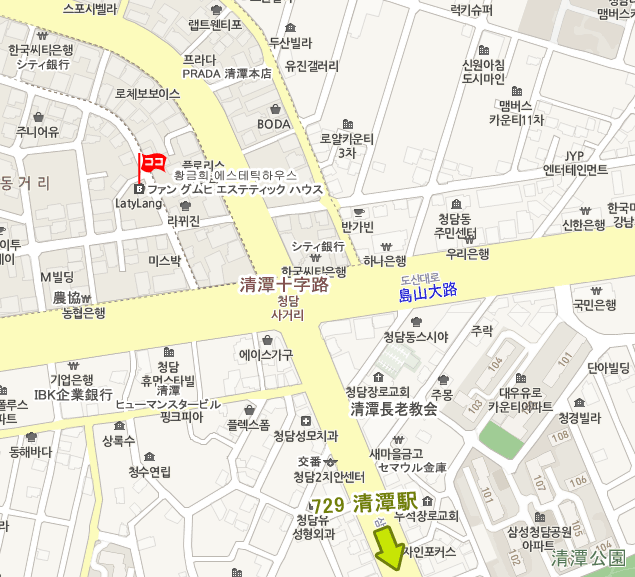 現地 アクセス  地下鉄 7号線 清潭 駅(No.729チョンダム・Cheongdam)8番出口から歩いて約 15分所要。