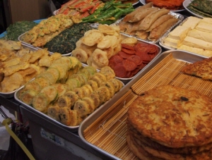 チョンゲ川を散歩しながらソウル在住の友人お奨めの広蔵市場に行って来ました。 夕方過ぎごろでしたけど市場内にずらーっと並んだ屋台には もうたくさんの人で賑わっていました。 私は混雑した場所が苦手なので、どこでもいいから座りたかったんですが 友人は一通り見て決めた方がいいと言い張って屋台のおばちゃんの声も無視して歩きまわり やっと中央付近の刺身の屋台に落ち着きました。 イカと白身のお刺身で清酒を軽く飲んで次は揚げ物のお店へ。 ここで揚げ物とマッコリでだいぶお腹がいっぱいになったんですが 最後に「麻薬キンパブ」で締めました。 この日は友人が全部支払ってくれたので値段はわかならいんですが 「刺身だけがちょーっと高かった」らしいです。 でも味はどれもよくて、雰囲気も「外国」を感じることができて 印象に残る夕食になりました☆ 買い物はあまり興味がなかったんでしなかったんですが 私みたいな初心者では一人では難しいかな~っていう印象でした。 一つだけ辛かったことがあって、それはトイレの場所。 トイレがなかなか見つからず、地下街の入口まで行くのが結構辛かったです。 これ以外は大・大満足でした。