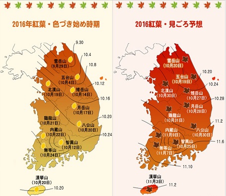 [社会ニュース] 2016年韓国の紅葉時期予想