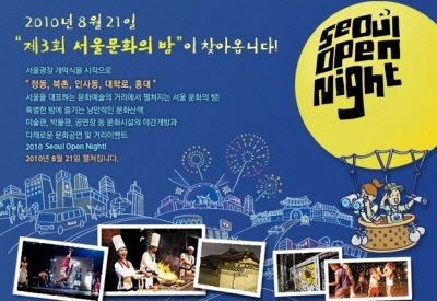 今年で3回目を迎える「ソウル文化の夜」が8月21日(土)に開催されます。 ソウル文化の夜では、ソウル市内の古宮や博物館、美術館が 夜の12時まで延長公開されるほか、ソウルの文化芸術の代表地である 貞洞(ジョンドン)、北村(プッチョン)、仁寺洞(インサドン)や 様々なジャンルの若い芸術家が集う大学路(テハンノ)や弘大(ホンデ)一帯で イベントが行われる予定となっています。また当日18:30からは ソウル市庁前のソウル広場で開会式が行われます。 貞洞一帯では、「NANTA」や「微笑(ミソ)」といった公演一つとと無料公演が 行われる徳寿宮への入場が「文化パス(1万ウォン)」一枚で楽しめます。 また仁寺洞では「JUMP」や「サチュム」の公演も文化パスで鑑賞できます。 同様に北村や大学路でも大道芸など様々なイベントが行われる予定となっています。 「文化パス」はインターネットでの事前購入や現地でも販売されます。