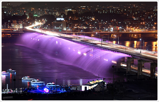 韓国で夜景スポットとして大人気の盤浦大橋(パンポテキョ)。人気の理由は月光レインポー噴水(タルビッムジゲプンス)。