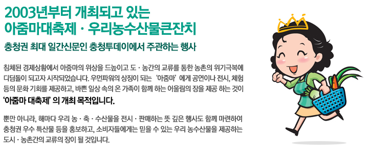 アジュンマとは、韓国語で「おばさん」のこと。韓国アジュンマパワーは日本でも有名ですが、停滞する経済状況の中、市民との交流を通し農村の危機克服しようと2003年から始まったアジュンマ大祝祭。この大祝祭では公演、展示や体験等のプログラムが行われ毎年大勢のアジュンマたちで大変賑わいます。また、忠清圏(韓国の中部と中西地域)特産物等の紹介や販売もあるので十分に楽しむことができます。韓国アジュンマパワー、あなたも体験してみてはいかがでしょうか。 <日程> 2012年9月14日(金)~16日(日)(3日間) <場所> 大田(テジョン)老陰農水産物卸売市場(ノウンノンサンムルトメシジャン) <アクセス> ソウル→大田(テジョン)は、KTX 大田(テジョン)のワールドカップ競技場駅7番出口前 <プログラム> ☆9/14(金) 10:00 開幕式 10:30~11:30 開幕式特別イベント”愛のキムチ分け合い” 12:00~12:30 白米分け合い 13:30~14:00 私たちの農水産物競売 14:00~15:00 アジュンマ・ロデオ競技 16:00~17:00 団体大縄跳び大会 19:00~20:00 コンサート7080 ☆9/15(土) 10:00~11:30 ダイエットダンス・フェステイバル 13:00~14:30 カラオケ大会(予選) 15:00~16:00 アジュンマ腕相撲大会 16:30~17:30 アジュンマ・ロデオ競技 18:00~18:30 テコンドーの公演 18:30~20:00 アジュンマのコンサート ☆9/16(日) 10:30~11:30 企画行事 12:00~12:30 私たちの農水産物競売 14:00~16:00 カラオケ大会(決戦) 16:00~16:30 景品くじ引き 18:00~18:25 キム・チョンソンさんの歌の教室 18:00~20:00 開かれて音楽会 <詳細> http://www.ccmama.co.kr/ (韓国語) ※現地での事情により現在とは記事の内容が異なる可能性がありますのでご了承下さい。