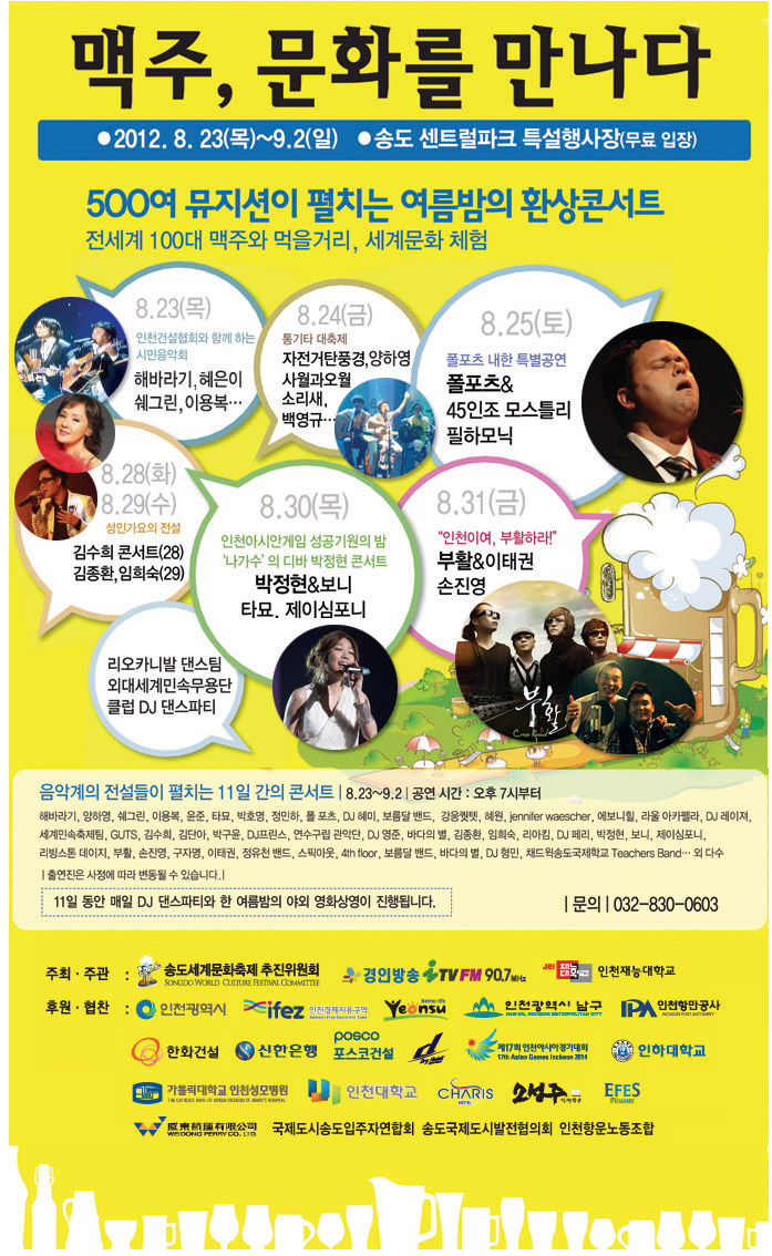 2011年夏に15日間連続満席、動員数延べ15万人、375名舞台出演の大記録を作ったあのイベントが今年もやってきます。超高層ビルが密集する「韓国のドバイ」仁川松島(ソンド)国際都市で世界のビール、文化、歌、人が集まる国内最大のビールの祭典、「2012松島(ソンド)世界文化祭り」が8/23~9/2(11日間)まで開催されます。この祭典では、韓国国内はもちろんヨーロッパ、アジアなど世界各国のビールやグルメを楽しむことができ、またビールをテーマとした各国の伝統文化体験、DJダンスパーティー、野外映画館や500人ものミュージシャンの公演など多種多様なイベントが予定されています。ビールを飲みながら文化に触れてストレス発散してみてはいかがでしょうか。 <日程> 2012年8月23日(木)~9月2日(日)(11日間) 公演は午後7時~ <場所> 仁川 経済自由区域 松島(ソンド)国際都市 セントラルパーク 特設会場 <アクセス>仁川1号線・セントラルパーク駅下車。4番出口。 <入場料> 無料 <詳細>http://blog.naver.com/PostList.nhn?blogId=songdobeer&categoryNo=7(韓国語) <問合せ> 032)830-0600 (韓国語) ※現地での事情により現在とは記事の内容が異なる可能性がありますのでご了承下さい。