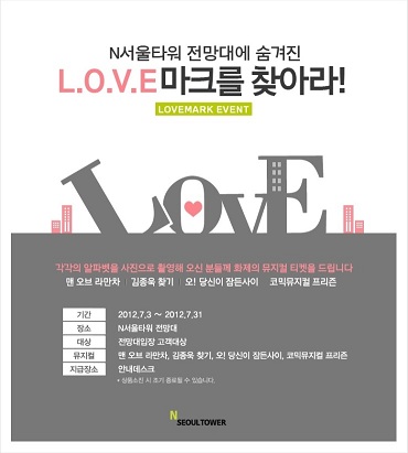 ソウルのランドマーク、Nソウルタワーで”L.O.V.E”マークを探すイベントが9/7~9/20まで開催されます。Nソウルタワーの展望台に隠されている”L.O.V.E”マークを探して写真で撮ってNソウルタワーの案内デスクに提示すると今話題のミュージカルチケットが貰えます。是非あなたも参加してみてください。 ≪期間≫ 2012年9月7日(金)~9月30日(日) ≪場所≫ Nソウルタワー展望台 ≪対象≫ 展望台入場したお客様のみ ≪商品ミュージカル≫ Man Of La Mancha (ラ・マンチャの男) Dlib Girls Die Leiden des jungen Werthers(若きウェルテルの悩み) ≪詳細≫ http://www.nseoultower.com/(韓国語) ※現地での事情により現在とは記事の内容が異なる可能性がありますのでご了承下さい。