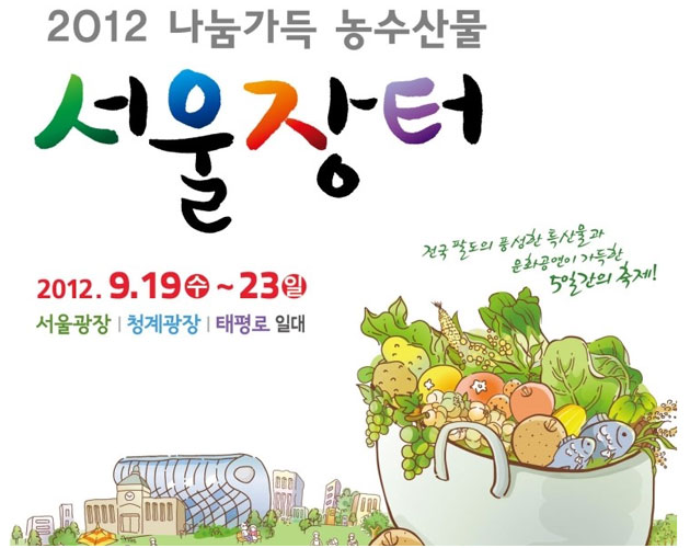 9月19日~23日の5日間ソウル広場、清渓(チョンゲ)広場、太平路(テピョンロ)一帯で「2012ソウル市場」が期間限定オープンします。韓国全国13ヶ所、144の市と郡における2000余りの豊富な農村特産物販売だけでなく文化公演など多彩なイベントが開催されます。ソウルにいながら他都市の特産が購入できる滅多にないチャンスですよ。 ≪日時≫ 2012年9月19日(水)~23日(日)(5日間) ≪場所≫ ソウル広場、清渓(チョンゲ)広場、太平路(テピョンロ)一帯 ≪アクセス≫ ☆ソウル広場: 地下鉄1号線市庁(シチョン)駅下車。8番駅出口てすぐ。 ☆清渓(チョンゲ)広場: 地下鉄5号線光化門(カンファムン)駅下車。5番出口を出て 世宗大路(セジョンデロ)を市庁(シチョン)駅方向に進む ≪主なイベント≫ ★見どころ満載の開閉幕式★ 式前公演 記念式 トロット歌手のチャン・ユンジョン TV生放送 主婦カラオケ大会 市民インタビュー ★豊かな秋夕★ Day/タイムセール 特価販売 幸運のルーレット 招待行事 ★持続的な交流★ 夜市場 花火 優秀伝統市場館 社会的企業、村企業館 全国愛-コインのは畑- アイスカフェ 分け合い広場 ★一緒に祝う祝祭★ 文化公演 体験イベント ≪詳細≫http://blog.naver.com/PostView.nhn?blogId=smarket2012&logNo=10145914234&categoryNo=0&parentCategoryNo=0&viewDate=¤tPage=3&postListTopCurrentPage=&userTopListOpen=true&userTopListCount=5&userTopListManageOpen=false&userTopListCurrentPage=3(韓国語) ※現地での事情により現在とは記事の内容が異なる可能性がありますのでご了承下さい。
