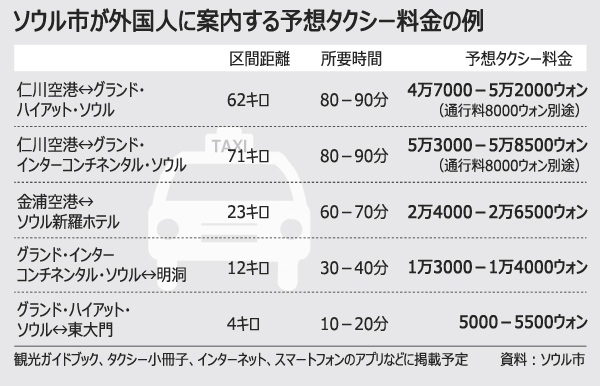 例えば、仁川国際空港からグランド・ハイアット・ソウルまで行く場合に予想されるタクシー料金は4万7000ウォン(約4000円)=通行料金別途=で所要時間は80-90分だという。ソウル市内の一般タクシーを基準に、割増料金が適用されていないことを前提に算出したものだ。予想タクシー料金表は今月末からソウル観光ホームページに掲載される。7月からはソウル観光アプリ、ガイドブック、タクシー内の小冊子などにも掲載される予定だ。