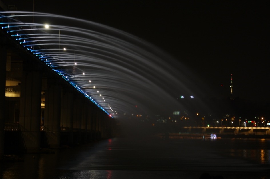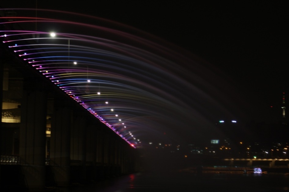 盤浦大橋からの噴水が見たくて、盤浦の漢江市民公園に行ってきました。 夕食を取ってから行ったので、ちょうど暗くなる時間で ライトアップされた橋から水が落ちる様子を見ることができました。 ちょうどそこに、こちらもライトアップされた遊覧船が近づいていて とってもキレイでした。 公園自体も川からの風が涼しいし、キャンプなのかテントを張って 休んでいる人もいてのんびりした雰囲気でとても良かったです。