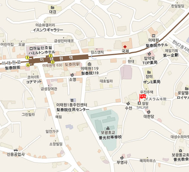 現地 アクセス  地下鉄6号線イテウォン(梨泰院・Itaewon・630)駅2番出口 徒歩約7分