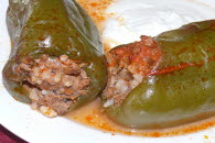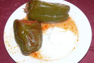 鶏肉のシシカバブ。余分な油がすっきりと落とされ、辛味もなくあっさりといただけます。 羊肉とごはん、野菜を混ぜ合わせ、ピーマンの中に詰めた料理。サワークリームをつけていただきます。