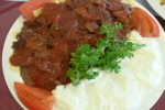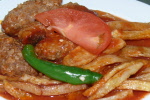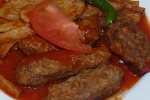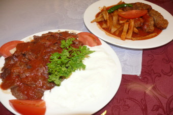 串に刺した肉の塊をそぎ落とすドネルケバブとパンをトマトソースで絡めヨーグルトを添えた料理。 羊肉をソーセージのような形にし、オーブンで焼いてポテトフライトと一緒に調理した料理。
