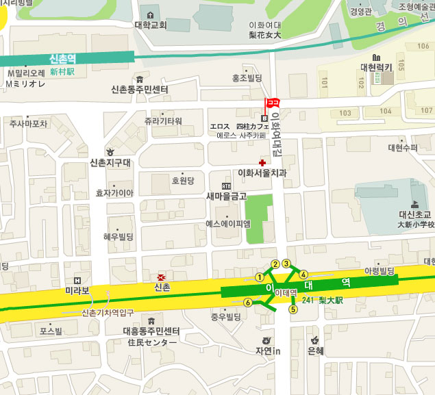 現地 アクセス  地下鉄2号線梨大(イデ、Ewha Womans Univ.)駅2番出口 徒歩3分