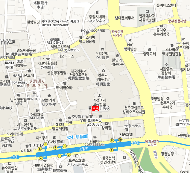 現地 アクセス  地下鉄4号線 No. 424 ミョンドン(明洞・Myeong-dong)駅9番出口から 徒歩約3分
