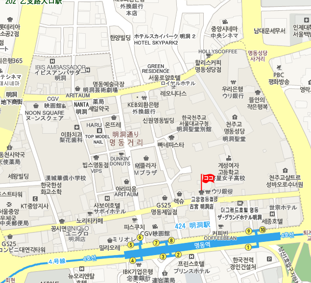 現地 アクセス  地下鉄4号線 No. 424 ミョンドン(明洞・Myeong-dong)駅10番出口から徒歩約5分