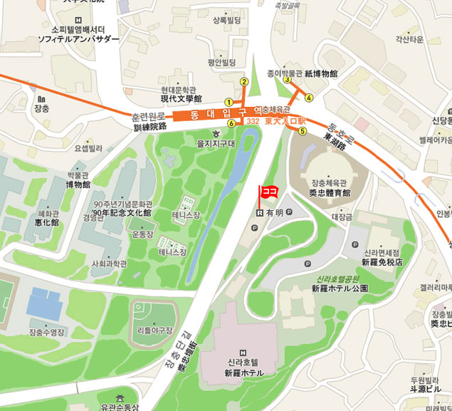 現地 アクセス               地下鉄3号線トンデイック(東大入口・Donggku University・332)駅5番出口から徒歩約5分,