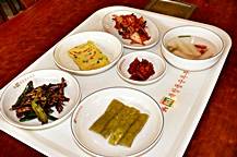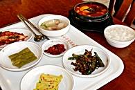 韓国料理の魅力は、メインの料理と共に出てくるおかず(サイド・ディッシュ)の豊富なこと。このお店でも、数種類のおかずが並びます。キムチはもちろん、豆腐を辛く煮込んだもの、ナムル、どんぐり豆腐(トトリムッ)、山菜などいろいろ並びますので、どんなものが出てくるか楽しみですよ。