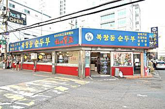 このスントゥブチゲはちょっと辛いですが、手軽でヘルシーな料理として人気があります。地下鉄5号線の麻浦(マッポ)駅と孔徳(コンドク)駅の中間にあるこの「北倉洞 純豆腐(プッチャンドン スントゥブ )」はスントゥブ一筋で頑張ってきたところ。最近はアメリカでの成功に続き、日本でも東京の大久保に支店をオープンしました。