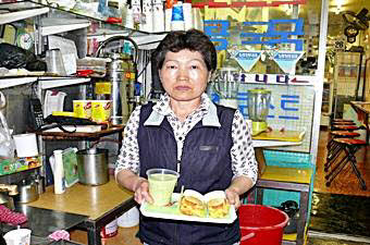 トーストと一緒にコンクッはいかかでしょうか。コンクッは日本で言う豆乳で、なぜか韓国ではトーストとコンクッをいっしょに頼む人が多いものです。「シンチャントースト」の場合、フルーツジュースも魅力いっぱい。店頭に並べてあるバナナ、トマト、キーウィなどの新鮮な果物で作ってくれるフルーツジュースも、まさに手作りの美味しさ。朝ごはんの代わりに、あるいはおやつにピッタリのトーストをぜひ一度お試しください。優しいアジョシとアジュマが待っています。
