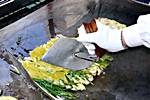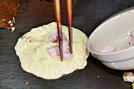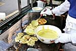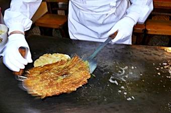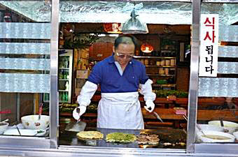 南浦洞でピンデトックやパジョンを食べたくなったらこの店はどうですか? ピンデトックは、緑豆を挽いたものを鉄板で焼いたもの。さくっとした歯ざわりと香ばしい香りが楽しいピンデトックは、そのまま食べてもいいですし、マッコリ(ドブロク)の肴にも最高です。このお店のピンデトックの秘密は、石臼で引いた緑豆とオリーブ油。緑豆はミキサーなどの機械を使ってもピンデトックのタネを作ることができますが、ご主人によると、昔ながらの石臼で挽いたものがやはり一番美味しいそうです。