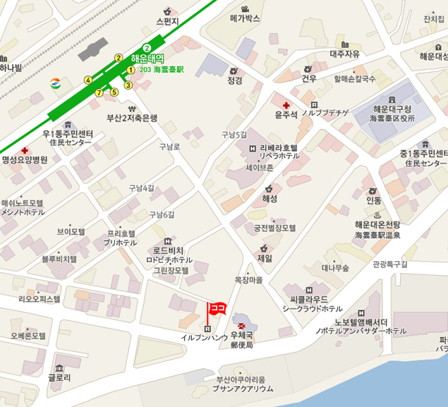 現地 アクセス  地下鉄2号線ヘウンデ(海雲台・Haeundae)駅で下車。3番又は5番出口徒歩7分