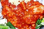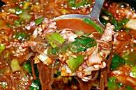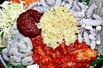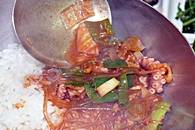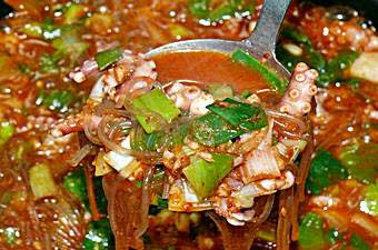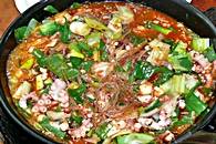 東莱など釜山地方のナクチポックンはソウルとは違って鍋タイプの独特のもの。ダシスープに細かく刻んだ野菜やヤムニョン(コチュジャンやニンニク等をあわせたもの)を加え食べやすく切ったタコを入れて仕上げてあります。 お昼にはご飯の上にかけてそのまま食べたり、夕食にはお酒と一緒に楽しんだ後、残ったスープに麺を入れてもいいし、ご飯を入れて炒飯にしてと食べ方もいろいろあって楽しめます。