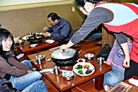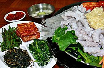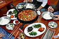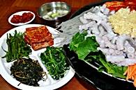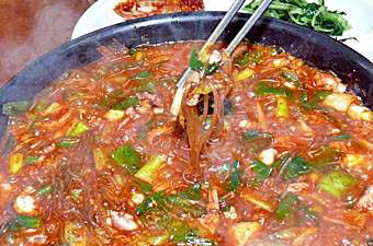 プサンで素朴な地元の料理を味わいたかったら、やはり中心地や有名な観光地以外にも足を伸ばしてみましょう。東莱温泉エリアには、まだ素朴なお店が残っていますが、その一つが「元祖(ウォンジョ)ジョバンナクチ」です。韓国人のよく食べる海産物の一つにナクチがあります。新鮮なものは、まだ動いているものにごま油をかけて食べたりします。また、野菜と一緒にコチュジャンで辛く炒めたものをご飯の上に載せれば、ナクチトッパップ。これも、学生や庶民に人気のメニュー。さて、このお店のナクチポックムは少し変わっています。浅いナベにスープが入り、そこにナクチなどの材料を入れますから、ポックム(炒め物)というよりナベの感覚です。