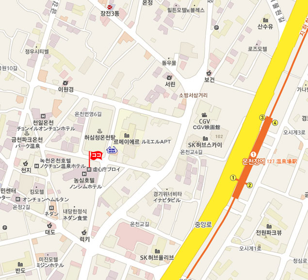 現地 アクセス  地下鉄1号線温泉場(Oncheonjang)駅1番出口から徒歩10分。ホテル農心の横。