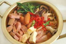 プデチゲは、韓国料理ではあまり使われないハム(ランチョンミート)やソーセージなど、洋風の食材を用いた鍋料理です。ハムやソーセージが、粉とうがらしや白菜キムチを用いて辛く味つけたスープとよく合い、韓国では若い世代を中心に人気の高い料理です。