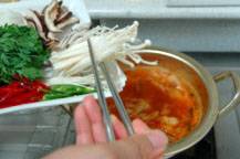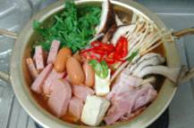 ◇キムチスープが沸騰したら野菜を加え、更にソーセージ、ハム類、豆腐を加えて煮込んでいく。塩などで味を調え、味が薄いようならキムチの汁などを加えていく