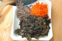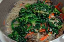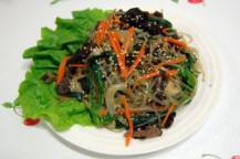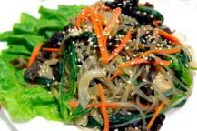 チャプチェはタンミョンと呼ばれる春雨と野菜、細切りにした肉を炒め合わせ、醤油、黒砂糖、塩などで甘辛く味をつけた料理で、チャプチェはお祝いの席や客を招いての食事会などに欠かすことのできない前菜料理です。李氏朝鮮時代の17世紀頃に作られた料理とされ、元々は野菜とキノコを材料とした簡単なものが、後に中国料理の影響を受け、唐麺(タンミョン:春雨)を入れる今の形になったと言われています。辛い料理が多い韓国の中でも小さな子供でも食べられる前菜料理として人気の高い一品です。ちなみに韓国のタンミョンはサツマイモのでんぷんから作られていて、日本の春雨に比べかなり太麺で歯応えがあります。※韓国春雨の代わりに糸こんにゃくでも代用できます。