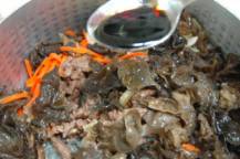 ◇大き目のボウルに牛肉や野菜など炒めた材料と春雨をいれ砂糖と醤油、ごま油で味を調えながらよく混ぜてゆきます。