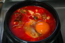 スンドゥブチゲとは、押し固めずに作った水分を多く含む柔らかい状態の豆腐(スンドゥブ)を使った韓国のスープ料理です。一般的にアサリやシジミを敷いた小さな土鍋(トゥッペギ)に豆腐や野菜、肉を入れ、コチュジャン(唐辛子味噌)やコチュカル(唐辛子の粉)で辛く味付けて煮込み、最後に生卵を落として仕上げます。一般的な家庭料理なので、料理法や具材は多種多様、中には唐辛子を使用しない白い(辛くない)スンドゥブチゲもあります。