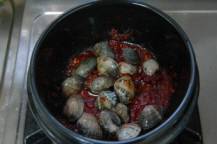 ◇ニンニクと唐辛子がよく混ぜ合わったらアサリを加え、さらに炒める。