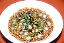◇濃口醤油(なければ普通の醤油)大さじ3、お酢、おろしニンニク、みじん切りにした小口ねぎ、青とうがらし、赤とうがらし、ごまを分量どおり加え、よく混ぜ合わせ薬味を作ります。