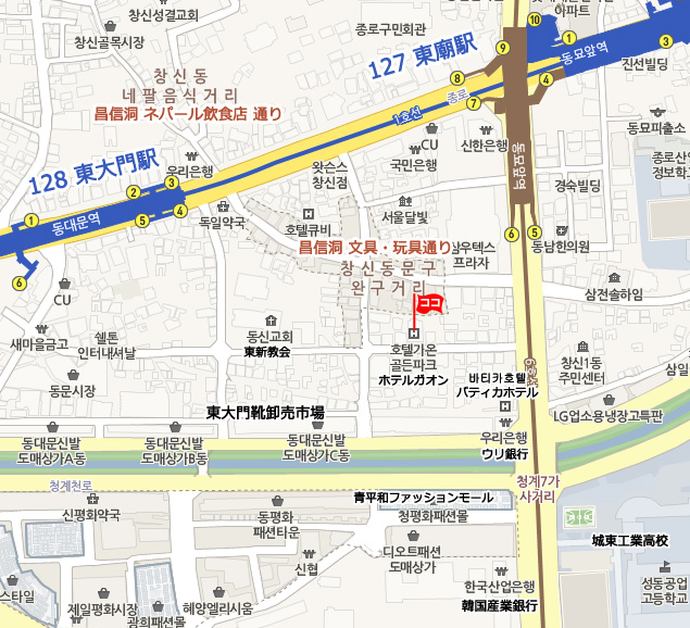 ♣ 仁川空港 ⇒ ホテル アクセス • 一般リムジンバス : バス乗場:《第1T》5B 《第2T》30 運行間隔20分 所要時間 約80分 6002番(清涼里)バスに乗り、東大門にて下車。徒歩約5分。 • タクシー : 一般60,000ウォン、模範90,000ウォン程度 所要時間 : 60分 ♣ 金浦空港 ⇒ ホテル アクセス • 空港鉄道A`REX : 金浦空港 (Gimpo Int’l Airport)駅から空港鉄道に乗車し、孔徳 (Gongdeok)駅 にて地下鉄6号線に乗換え,東廟前(Dongmyo)駅で下車。6番出口から徒歩約3分。 • タクシー : 一般25,000ウォン程、模範40,000ウォン程、所要時間 : 約40分 ♣ その他 情報 • チェックイン 15:00、 チェックアウト 11:00 • NHKなど衛星放送 受信可。 • 徒歩 2分以内にコンビニあります。 • 現地の事情により予告なしに変更される場合もございます。あらかじめご了承ください。 • 予約の確認、変更依頼、取消はMy予約確認ページにて行えます。 • メール送受信状況の確認、お客様とハナビツアーとのメッセージのやりとりはMy予約確認ページ ⇒ メール送受信 にて行えます。 • 最終更新日 : 2017. 11. 7