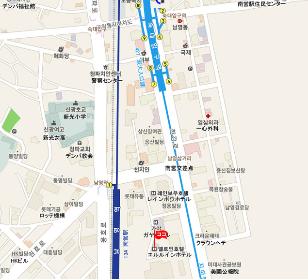 ♣ 仁川空港 ⇒ ホテル アクセス • 一般リムジンバス : バス乗場:《第1T》5B 《第2T》29 運行間隔25分 所要時間 約70分 6001番(ソウル駅行き)に乗り、4号線の淑大入口(スッテイック)駅にて下車。徒歩約7分。 • 空港鉄道A`REX : 仁川国際空港駅(Incheon Int'l Airport) より空港鉄道に乗車し、ソウル駅にて地下鉄1号線に乗換えて 南営(Namyeong)駅にて下車後。1番出口より徒歩1分。 • タクシー : 一般60,000ウォン、模範90,000ウォン程度 所要時間 : 約60分 ♣ 金浦空港 ⇒ ホテル アクセス • 空港鉄道A`REX : 金浦空港 (Gimpo Int’l Airport)より空港鉄道に乗車し、ソウル駅にて地下鉄1号線乗換えて 南営(Namyeong)駅にて下車後。1番出口より徒歩1分。 • タクシー : 一般30,000ウォン程、模範45,000ウォン程、所要時間 : 約40分 ♣ その他 情報 • チェックイン 14:00、 チェックアウト 12:00 • 徒歩 2分以内にコンビニあります。 • NHKなど衛星放送 受信可。 • 現地の事情により予告なしに変更される場合もございます。あらかじめご了承ください。 • 予約の確認、変更依頼、取消はMy予約確認ページにて行えます。 • メール送受信状況の確認、お客様とハナビツアーとのメッセージのやりとりはMy予約確認ページ ⇒ メール送受信 にて行えます。 • 最終更新日 : 2019. 12. 11