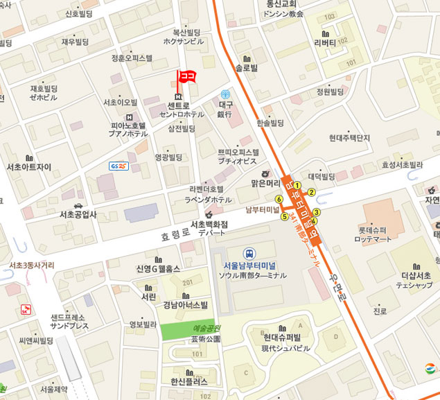 ♣ 金浦空港 ⇒ ホテル アクセス • 地下鉄 : 金浦空港 (Gimpo Int’l Airport)から地下鉄9号線に乗り、高速バスターミナル(Express Bus terminal)駅で地下鉄3号線に乗換えて 南部ターミナル(Nambu Bus Terminal)駅で下車。 6番出口から徒歩5分。 • 一般リムジンバス : バス乗場:国際線6番 国内4番 運行間隔15分 所要時間 約60分 6000番(蚕室方面行き)バスに乗り、高速バスターミナルにて下車後。タクシーで約10分。 • タクシー : 一般30,000ウォン程、模範50,000ウォン程、所要時間 : 約60分 ♣ その他 情報 • チェックイン 18:00、 チェックアウト 12:00 • 徒歩 2分以内にコンビニあります。 • NHKなど衛星放送 受信可。 • 現地の事情により予告なしに変更される場合もございます。あらかじめご了承ください。 • 予約の確認、変更依頼、取消はMy予約確認ページにて行えます。 • メール送受信状況の確認、お客様とハナビツアーとのメッセージのやりとりはMy予約確認ページ ⇒ メール送受信 にて行えます。 • 最終更新日 : 2017. 2. 26