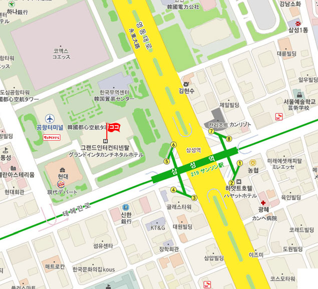 【 アクセス】 ♣ 仁川空港 ⇒ ホテル アクセス • KALリムジンバス : バス乗場:《第1T》3B 《第2T》19 運行間隔:20~30分 所要時間:100分 6703番(江南行き)バスに乗車し、グランドインターコンチネンタルにて下車。 • タクシー : 一般52,200ウォン、模範90,000ウォン程度 所要時間 : 約100分 ♣ 金浦空港 ⇒ ホテル アクセス • 地下鉄 : 金浦空港 (Gimpo Int’l Airport)から地下鉄5号線に乗車し、永登浦区庁(Yeongdungpo -gu office)駅にて地下鉄2号線に乗換えて 三成(Samseong)駅下車。 5番出口から徒歩約3分。 ※エレベータを利用する場合は6番出口からホテルへ • 高級リムジンバス : バス乗場: 国際線6番 国内線4番 運行間隔:15~20分 所要時間:70分 6000番(蚕室行き)バスに乗車し、地下鉄2号線三成(サムソン)駅下車。徒歩約5分。 • 一般リムジンバス : バス乗場: 国際線6番 国内4番 運行間隔:30分 所要時間:50分 6104番(都心空港ターミナル行き)バスに乗車し、都心空港ターミナル(2階)にて下車。徒歩約3分。 • タクシー : 一般23,100ウォン程、模範50,000ウォン程、所要時間 : 約45分 ♣ その他 情報 • チェックイン 15:00、 チェックアウト 12:00 • NHKなど衛星放送 受信可。 • Wi-Fi(全客室有、有料)、有線LAN接続(全客室有、有料) • 徒歩 2分以内にコンビニあります。 • 現地の事情により予告なしに変更される場合もございます。あらかじめご了承ください。 • 予約の確認、変更依頼、取消はMy予約確認ページにて行えます。 • メール送受信状況の確認、お客様とハナビツアーとのメッセージのやりとりはMy予約確認ページ ⇒ メール送受信 にて行えます。 • 最終更新日 : 2017. 2. 27