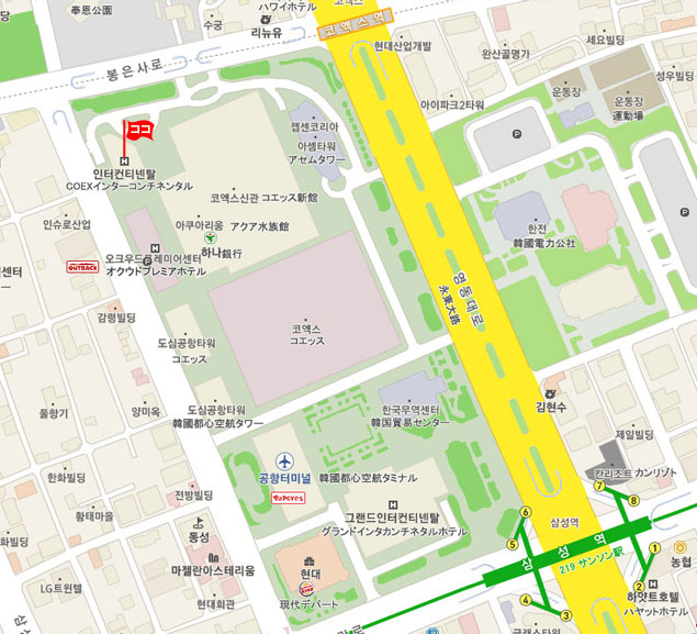 【 アクセス 】 ♣ 仁川空港 ⇒ ホテル アクセス • KALリムジンバス : バス乗場:《第1T》3B 《第2T》19 運行間隔:20~30分 所要時間:87分 6703番(江南行き)バスに乗車し、COEXインターコンチネンタルにて下車。 • タクシー : 一般51,800ウォン、模範100,000ウォン程度 所要時間 : 約78分 ♣ 金浦空港 ⇒ ホテル アクセス • 地下鉄 : 金浦空港 (Gimpo Int’l Airport)駅から地下鉄5号線に乗車し、永登浦区庁(Yeongdungpo -gu office)駅にて地下鉄2号線に乗換え 三成(Samseong)駅下車。 6番出口から 徒歩 約10分。 • 高級リムジンバス : バス乗場: 国際線6番 国内線3番 運行間隔:30分 所要時間:50分 6104番バスに乗り、都心空港ターミナル(2階)にて下車。徒歩約10分。 • タクシー : 一般22,900ウォン程、模範70,000ウォン程、所要時間 : 約44分 ♣ その他 情報 • チェックイン 15:00、 チェックアウト 12:00 • NHKなど衛星放送 受信可。 • Wi-Fi(全客室有、有料)、有線LAN接続(全客室有、有料) • 徒歩 2分以内にコンビニあります。 • 現地の事情により予告なしに変更される場合もございます。あらかじめご了承ください。 • 予約の確認、変更依頼、取消はMy予約確認ページにて行えます。 • メール送受信状況の確認、お客様とハナビツアーとのメッセージのやりとりはMy予約確認ページ ⇒ メール送受信 にて行えます。 • 最終更新日 : 2017.03.14