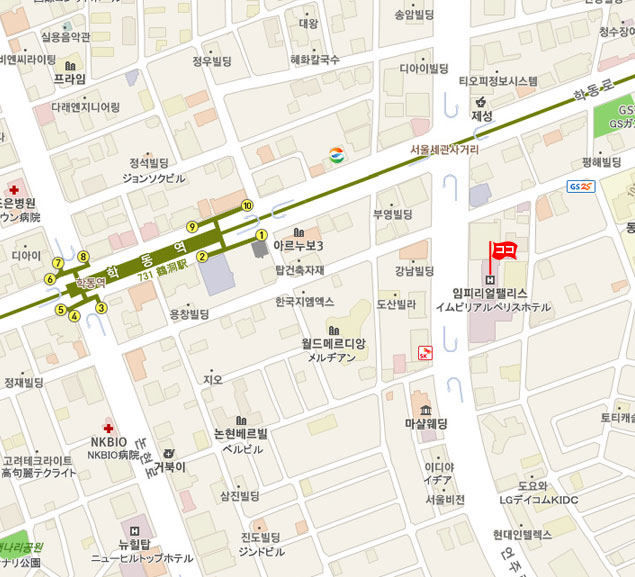 【 アクセス】 ♣ 仁川空港 ⇒ ホテル アクセス • KALリムジンバス : バス乗場:《第1T》3B 《第2T》19 運行間隔:20~30分 所要時間:75分 6703番(江南行き)バスに乗り、インペリアルパレスホテルにて下車。 • タクシー : 一般48,900ウォン、模範90,000ウォン程度 所要時間 : 約75分 ♣ 金浦空港 ⇒ ホテル アクセス • 地下鉄 : 金浦空港 (Gimpo Int’l Airport)駅から地下鉄9号線に乗車し、高速バスターミナル(Express Bus terminal)駅にて地下鉄7号線に乗換えて 鶴洞(Hak-dong)にて下車。 4番出口徒歩約5分。 • 一般リムジンバス : 乗り場:国際6番,国内4番 運行間隔:15~20分 所要時間:50分 6000番(蚕室行き)バスに乗車し、高速バスターミナル下車にて下車。タクシーで約5~6分。 • タクシー : 一般20,500ウォン程、模範50,000ウォン程、所要時間 : 約41分 ♣ その他 情報 • チェックイン 15:00、 チェックアウト 12:00 • 徒歩 2分以内にコンビニあります。 • NHKなど衛星放送 受信可。 • 現地の事情により予告なしに変更される場合もございます。あらかじめご了承ください。 • 予約の確認、変更依頼、取消はMy予約確認ページにて行えます。 • メール送受信状況の確認、お客様とハナビツアーとのメッセージのやりとりはMy予約確認ページ ⇒ メール送受信 にて行えます。 • 最終更新日 : 2017. 10. 15