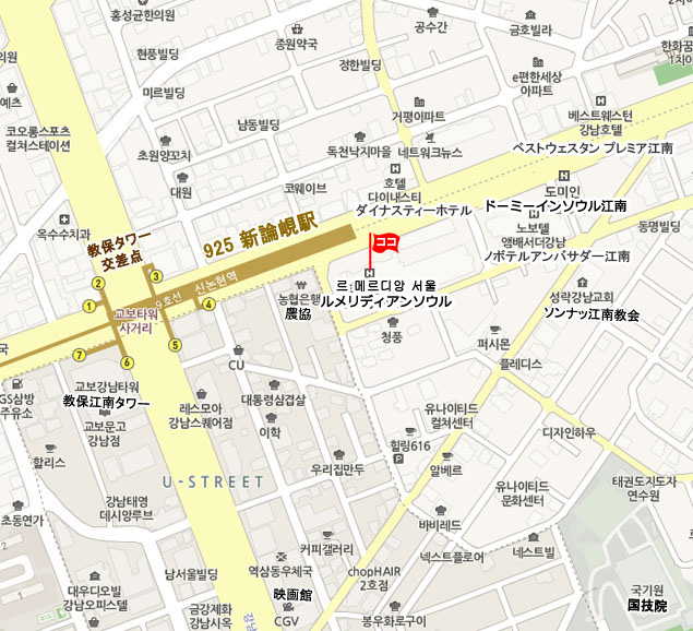 【 フロア ご案内 】 ♣ 仁川空港 ⇒ ホテル アクセス • KAL リムジンバス : バス乗場: 《第1T》3B 《第2T》19 運行間隔:30分 所要時間:80分 江南行き/6703番バスに乗り、ルメリディアンソウルにて下車。 • タクシー : 49,000ウォン程度 所要時間 : 約75分 ♣ 金浦空港 ⇒ ホテル アクセス • 地下鉄 : 金浦空港 (Gimpo Int’l Airport)駅から地下鉄9号線に乗車し、 22駅目の新論峴 (Sinnonhyeon)駅にて下車。 所要時間:直通30分、各駅45分。4番出口から徒歩3分。 • 高級 リムジンバス : バス乗場: 国際6番、国内4番 運行時間:15~20分 所要時間:52分 6000番(論峴駅行き)バスに乗り、地下鉄9号線新論峴(シンノニョン)駅(中央車路)にて下車。徒歩約10分 • タクシー : 一般20,000ウォン程度 所要時間 : 約39分 ♣ その他 情報 • チェックイン 15:00、 チェックアウト 12:00 • NHKなど衛星放送 受信可。 • 徒歩 2分以内にコンビニあります。 • 現地の事情により予告なしに変更される場合もございます。あらかじめご了承ください。 • 予約の確認、変更依頼、取消はMy予約確認ページにて行えます。 • メール送受信状況の確認、お客様とハナビツアーとのメッセージのやりとりはMy予約確認ページ ⇒ メール送受信 にて行えます。 • 最終更新日 : 2017.12.28