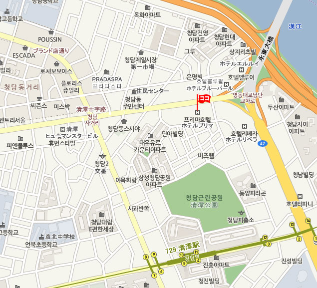 清潭(Cheongdam)駅にて下車。13番出口から徒歩約11分。