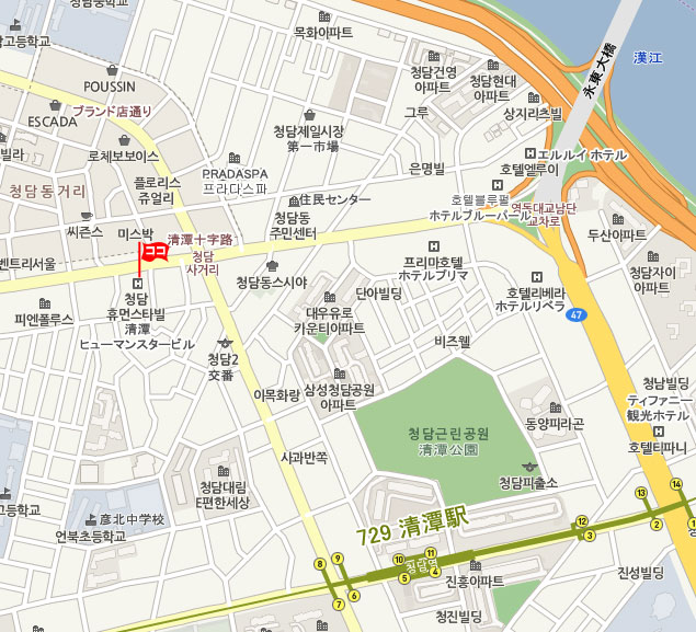 6006番(狎鴎亭・蚕室行き)バスに乗車し、ホテルリベラにて下車。徒歩約8分。