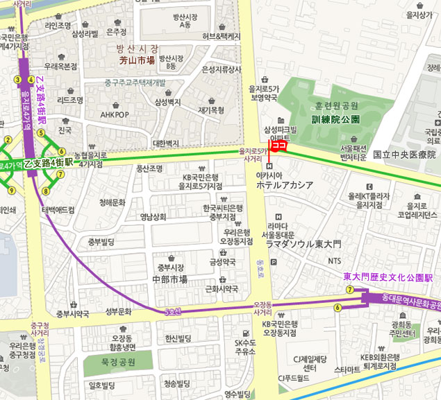 • 地下鉄 : 5号線 No.512 金浦空港 (Kimpo Intl Airport)駅からNo.535 乙支路4街(ウルチロサーガ)駅下車。