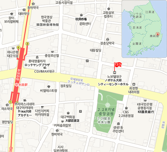 • 地下鉄 : KTX東大邱駅から地下鉄東大邱駅に移動し(約4分)地下鉄1号線に乗車し中央路駅下車。3番出口徒歩3分。