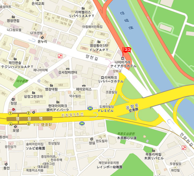 • 地下鉄 :  金浦空港(Gimpo Int’l Airport)から地下鉄9号線に乗車し、塩倉駅(Yeomchang)駅にて下車。2番出口から徒歩約5分。