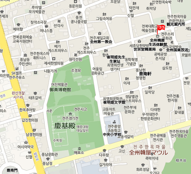 コアホテルから全州韓屋生活体験館 までタクシーで約5分。