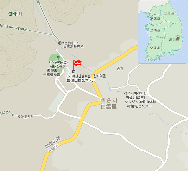•  ソウル南部バスターミナル:星州(ソンジュ)行き高速バスに乗車し、星州高速バスターミナル下車。星州バスターミナルから松渓(ソンゲ)-修倫(スリュン)-白雲洞(ぺクンドン)行きに乗車後、伽耶山国立公園バス停留所下車後徒歩約5分。